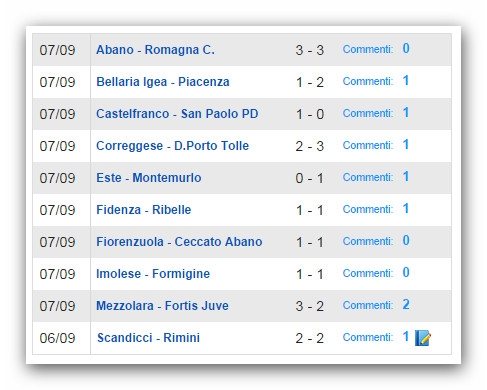 Quando a fianco del risultato troverete un numero (1) vuol dire che è presente un commento della partita. Cercheremo di avere più cronache possibili cercandole su internet, ma inseriremo anche quelle che ci manderete voi (in molti già lo fanno). Nulla toglie però, che siate voi stessi a fare l'inserimento. La cosa è semplicissima e credo che un aiuto a tenere "storia" di questo nuovo campionato sia un " bene" per il nostro movimento.