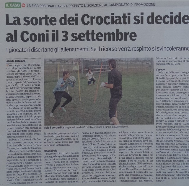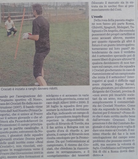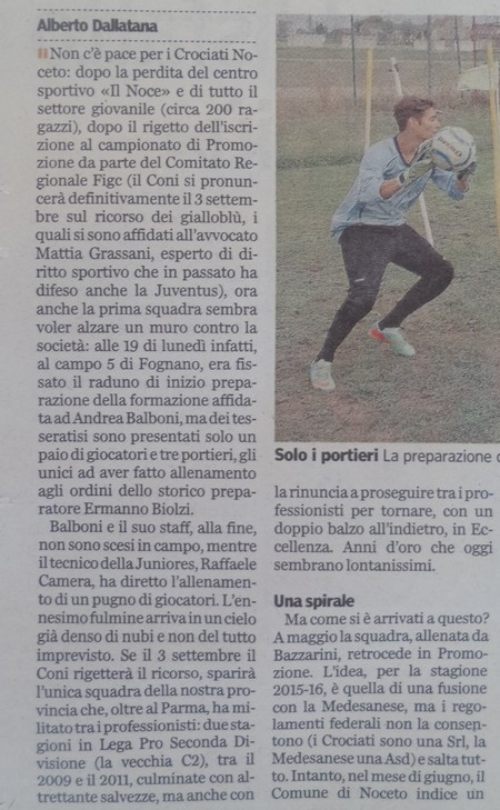 favoletta frivola e studiata a tavolino con chissà chi, che i Crociati Noceto hanno dovuto subire in questi due mesi più angherie di quelle che riceveva Paperino da suo zio Paperone. Non so se questo giornalista, ha peccato di filantropia, o se è stato solo compiacente nei confronti di chi sta portando in cattiva luce a livello nazionale tutto il calcio dilettante parmense (i Crociati Noceto). Credere, caro Dallatana, per filo e per segno, a quello che ti è stato detto dai diretti interessati , senza nemmeno che ti sfiorasse l’idea che ti stavano raccontando che la luna è una formaggia, è azione da cronista che più ingenuo non si può. Che tu sia stato "rubato" al ciclismo per quest 'unica occasione (Bernardini in ferie) è più che sospetto, e perciò lasciamo a chi ci legge tutte le deduzioni del caso. Tanto sai di calcio, che ti sei permesso di dire, " i Crociati Noceto avevano un settore giovanile che si chiamava Real Crociati". Questo equivale a dire che rubavano in chiesa. Svegliati ve! E’ vietato dai regolamenti Federali!!! Dire che sono difesi da un luminare che ha difeso la Juventus, senza dirne l’esito è buttare un po’ di polvere negli occhi a chi legge. Sul Noce hai detto che l' hanno perso, quando nememno hanno potuto partecipare al bando comunale (vedi debiti proprio con il comune).