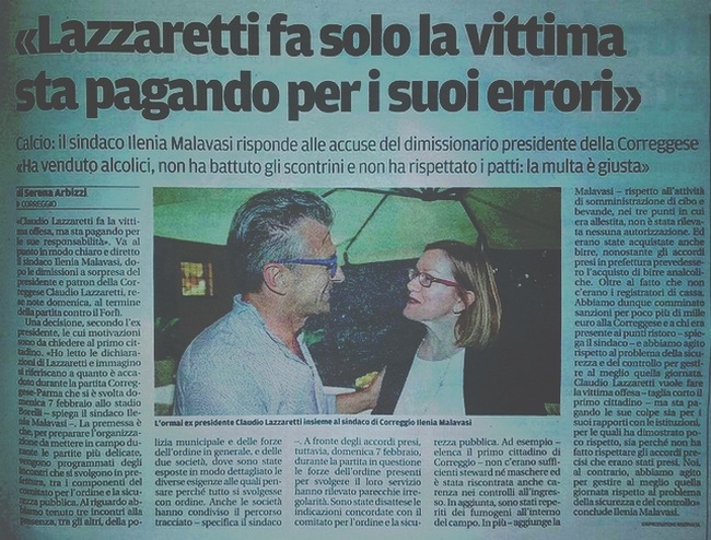 Tutto è successo nella partita Correggese - Parma dice il Sindaco di Correggio Ilenia Malavasi, che non le manda certamente a dire al Presidente Lazzaretti che domenica ha rassegnato le dimissioni per "problemi con il bar dello stadio". Il Sindaco racconta che la multa dei Vigili è stata fatta ai tre punti ristoro perchè senza registratori di cassa e per la vendita di alcolici, che era stata vietata durante gli incontri in prefettura. Aggiunge il Primo cittadino che gli steward erano insufficienti e che anche i controlli sicurezza non erano come previsti. Insomma, una fila di accuse non proprio "gentili" quelle dell'amministrazione del paese reggiano al Presidente della Correggese. Pensavamo che la cosa potesse rientrare, ma immaginiamo che la frase " Lazzaretti fa solo la vittima", lanciata dal sindaco a tutti i media reggiani, possa far decidere al Presidente di mollare la Correggese per entrare alla Reggiana o al Carpi, proprio come si dice da due anni a questa parte. Non sappiamo come andrà a finire questa brutta vicenda che coinvolge il calcio dilettanti della regione, ma quello che traspare, anche dalle parole del Sindaco, è che i rapporti tra le due parti erano tesi già da tempo. Un Sindaco offeso, perchè magari poco considerato, prima o poi te la fa "pagare la multa"! E' tanto prevedibile questo, che ci chiediamo come mai il Presidente della Correggese, sia caduto nella trappola. Ingenuità o come molyi suggeriscono, via di fuga creata ad arte? Presto sapremo!