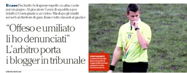 Il 30 novembre al tribunale di Bologna in via Farini è prevista la prima udienza. L’arbitro, Vincenzo De Pascalis, bolognese residente a Borgonuovo, di origini salentine, ha querelato per gli insulti patiti Giorgio Mansanti, blogger di professione, residente nel parmigiano e da 11 anni responsabile del sito EmiliaGol. A processo andrà anche il reggiano Marco Facchini,