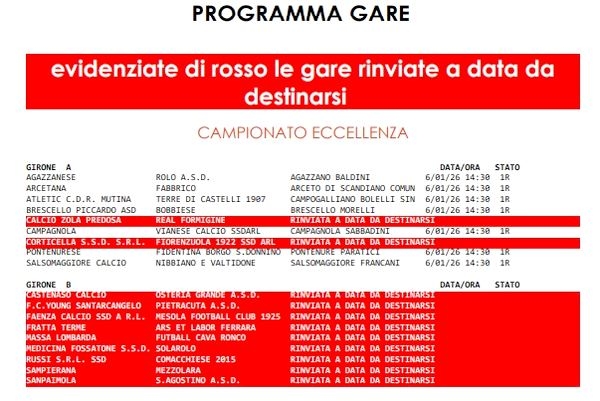Sospese due partite in Eccellenza A, rimangono in piedi le altre partite del Girone e anche la Promozione A e B, tutto sospeso il resto del programma di Eccellenza e Promozione per la nevicata che ha colpito Bologna e la Romagna. ULTIMA ORA, SOSPESO ANCH ETUTTO IL GIRONE B DI PROMOZIONE