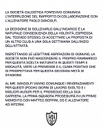 Borgotaro: sembrava che tutto fosse sistemato con la riconferma a tempo (due giornate), dopo la riunione tra la conduzione tecnica e la società che c'è stata lunedì sera, poi un bliz del DG DelNevo e del Ds Carlo Calchini avvenuto ieri sera, ha fatto si che stamattina, dopo evidentemente una "bella" riflessione, Mister Francesco Bertani fosse "obbligato" (indotto) a dare le dimissioni assieme a tutto il suo staff.